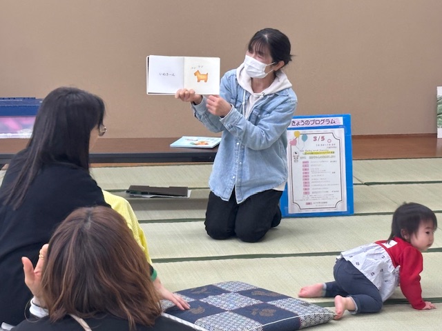 今回は、今年度最後おはなし会として、IPPO&わらべうた教室を開催しました。前半はIPPOで、かわいらしい動物の絵本や楽しい大型絵本、おおきなかぶのアニマシオンなど、いろいろなおはなしを楽しみました。後半はわらべうたの講師として基山より池末眞弓先生をお呼びして、わらべ歌教室を行いました。お母さんと触れ合いながらやさしい歌声に合わせて体を動かして、子どもたちの楽しげな笑い声であふれた、賑やかで楽しいわらべうた教室になりました。