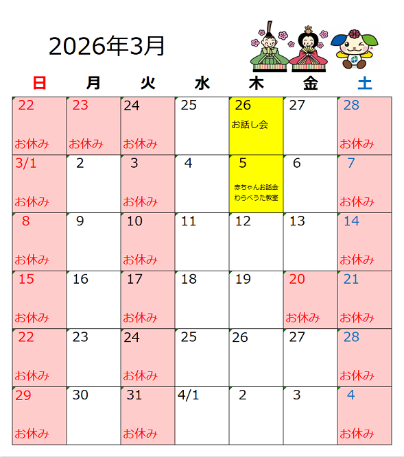 3月はおはなし会UPはお休みです。次回は、4月23日に開催予定です。お間違えの無いようお願い致します。