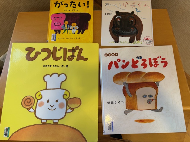 みんな大好きぱんどろぼうとひつじぱんを大型えほんで読みました。みんなとってもじょうずに聞いてくれました。また、お笑い芸人のトム・ブラウンの本 がったい!はみんなうけて大笑いしてくれました。