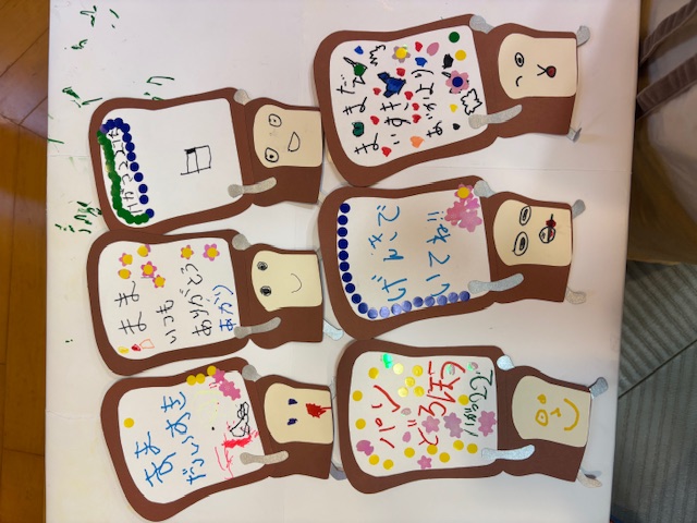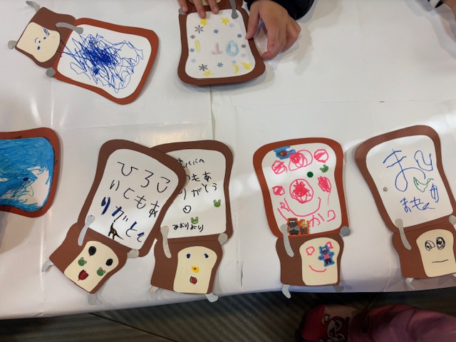 おはなしの後は、ワークショップでぱんどろぼうのメッセージカードづくりを行いました。みんなそれぞれのメッセージがぱんどろぼうに書かれていて、このカードをもらった人はあったかい気持ちになるんだろうと思いました。そんなすてきなおはなし会でした。