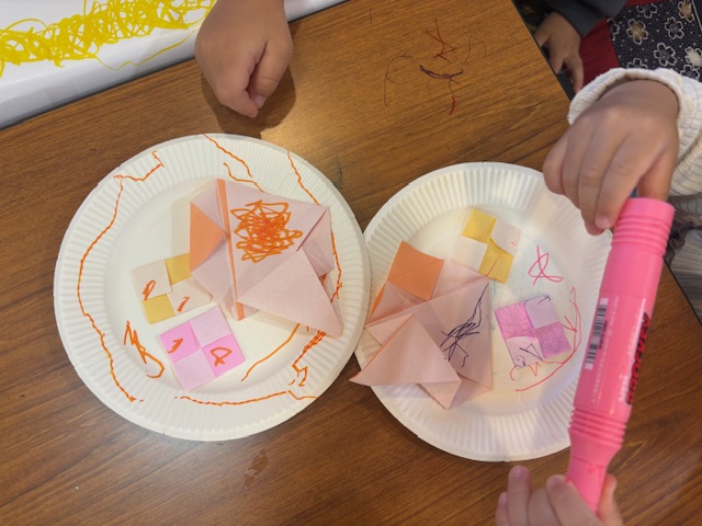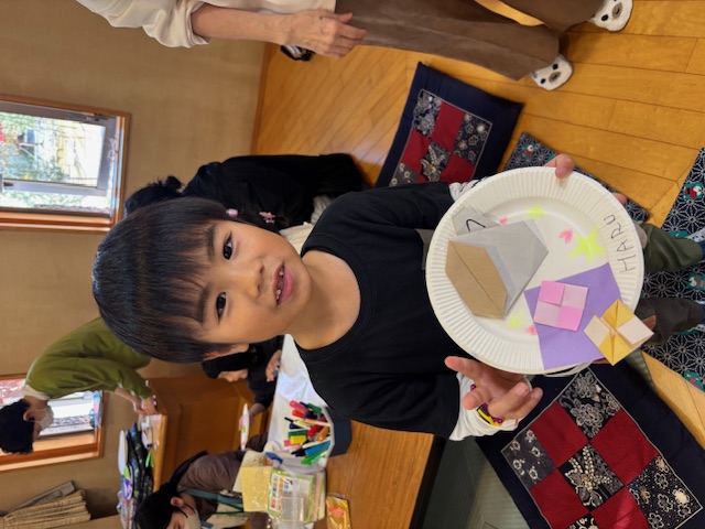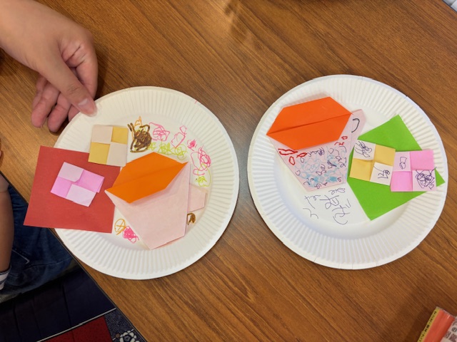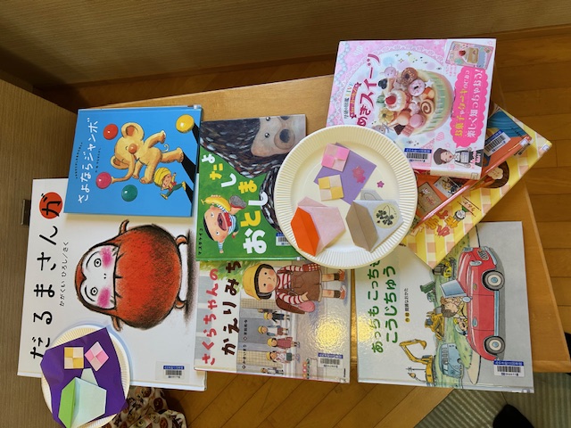 ワークショップは、おりがみでコーヒーカップとクッキーをおって、お皿にもりつけた壁面飾りを作りました。どの子も上手にカップとクッキーもおれていました。最後の飾りつけもそれぞれ自由に楽しそうにしてくれました。本日もたくさんのご参加ありがとうございました。次のおはなし会もお待ちしています。
