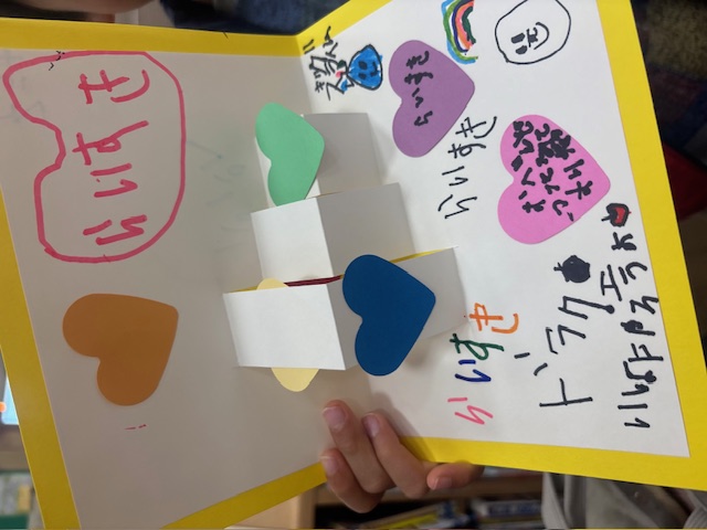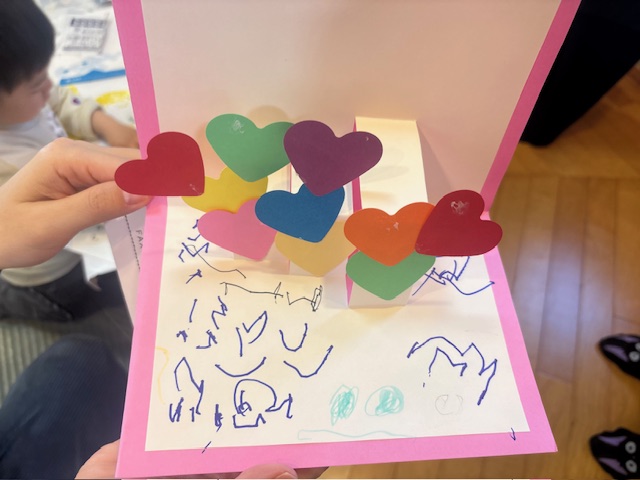 ワークショップでは、バレンタインメッセージカードを書きました。どの子も大好きな人へのメッセージを絵や文字で一生懸命かけていました。書いたメッセージカードは、ハートのポケットに入れて渡せるようにしました。ハートと一緒に子供たちの気持ちが届くといいなと思います。