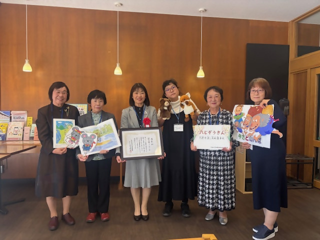 代表の柿本さんは、これからも学校、図書館などでの読み聞かせ活動を通じて、子どもたちにファンタジーの世界を伝えていきたいと話され、日頃の事例発表も息のぴったり合ったグループで行い、表彰状を受け取りました田・上村)、草場館長