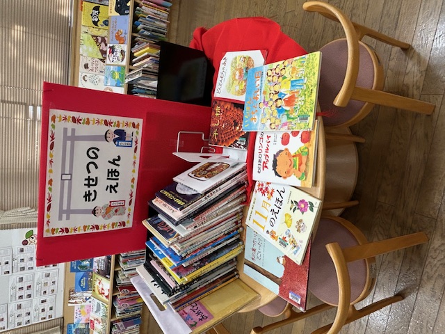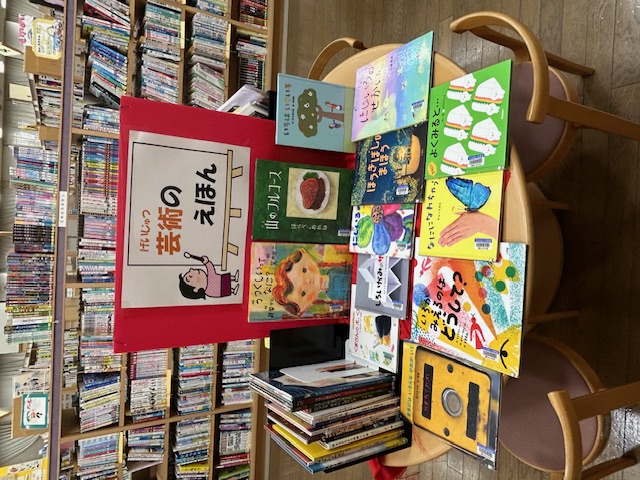 児童コーナーの円テーブルに、きせつのえほん、芸術のほん、何だコレ!?(ふしぎなえほん)を特集しています。ぜひすてきなおはなしをみつけてください